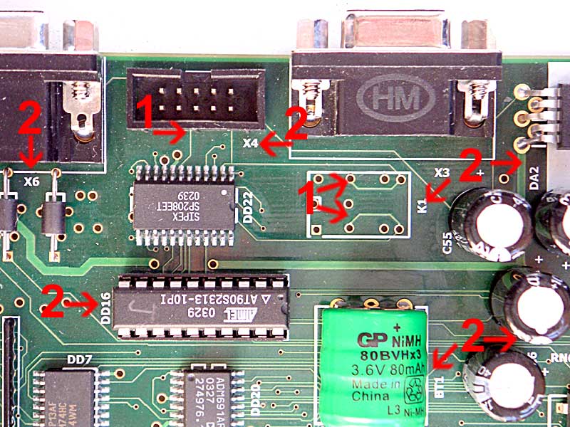 1. The sommers:In counterfeits two technological sommers are made by printed circuit, and in the original boards they are made of uninsulated wire and are mounted into the board by soldering. 2.Marking:The marking of many elements is different, for instance, BT1, C56, DA2, DD16, L3, L4, X6, K1. Counterfeits have no marking for X4 cutoff point tiers. |